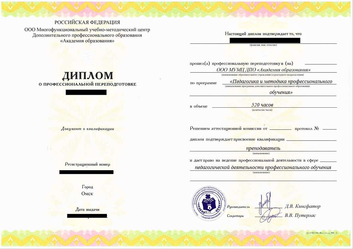 • «Преподаватель», с правом ведения профессиональной деятельности в сфере педагогической деятельности профессионального обучения